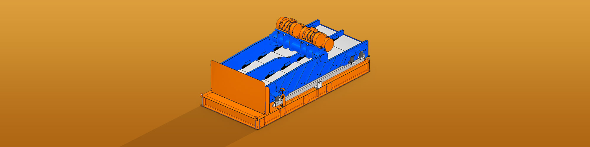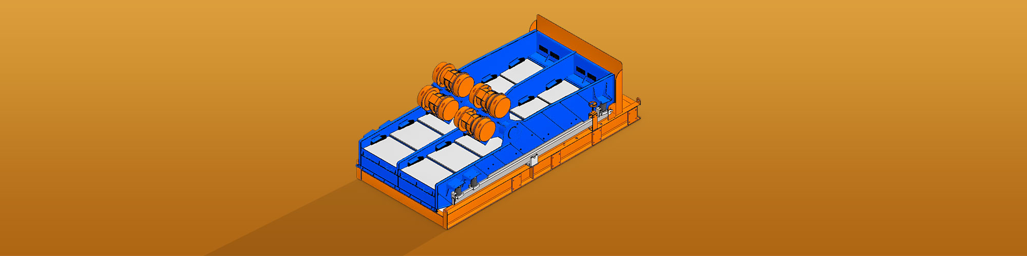 The 12-panel screening machine 6 PSD is used to dewater heterogeneous solid-liquid mixtures. With an acceleration force of up to 6.3 G it sets the frame sieves installed on it in motion, whereby the solid particles contained in the suspended suspension are dewatered. The grain size limit or the degree of fineness of the separation results from the mesh size of 11 x 3.5 mm to 11 x 0.3 mm and panel screens fine made of woven stainless steel with mesh sizes of 70 mesh (210µ / 0.21 mm) to 325 mesh (45 µm / 0.045 mm).